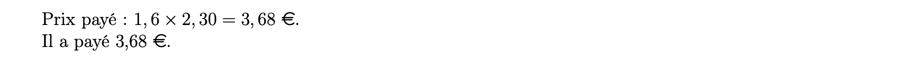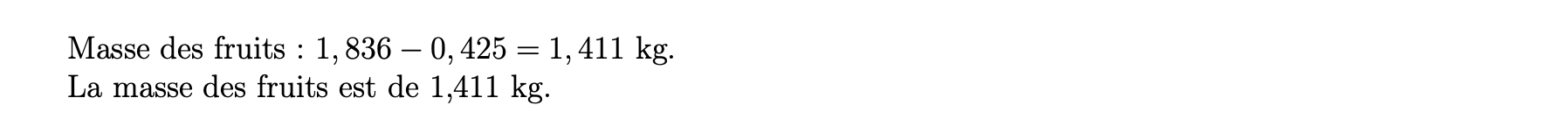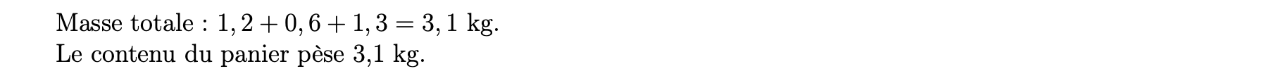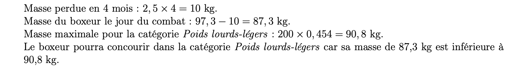 Coefficient : \( \dfrac{360}{800} = 0{,}45 \). On multiplie chaque masse par 0,45.
